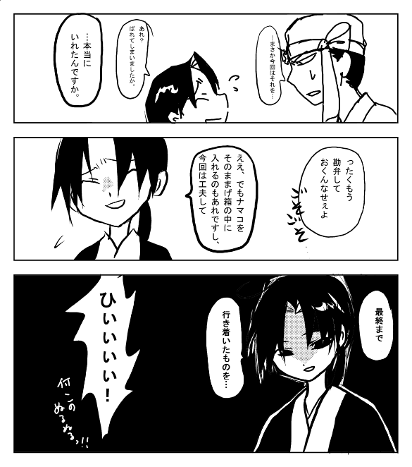 なんかげ箱の中に入れるために一人でナマコをにぎにぎしている先生を思い浮かべると ほほえましいものがありますね。(そうですか?) どうでもいいですがシカクナマコってなんか卑猥ですよね。(本当どうでもいい) なんかまだ続きそうです。 ←5の1へ 6へ→ 戻る